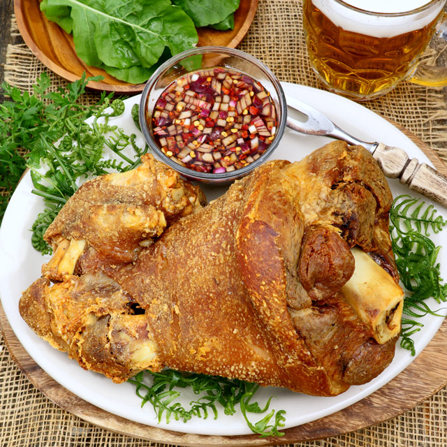 The meat is tender and juicy inside, with a crisp, crackling exterior.